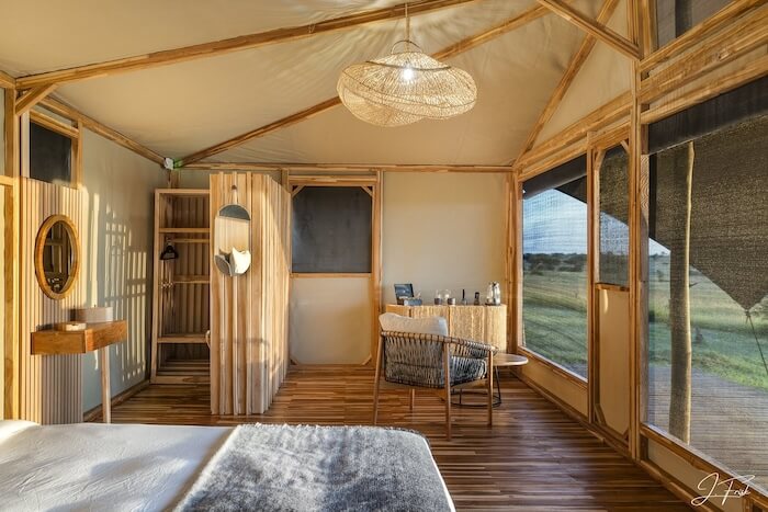 Guests stay in spacious tented suites on wooden platforms with en-suite bathrooms, rain showers, comfortable beds and private verandas with views of the savannah. The interior is modern, bright and carefully designed with natural materials, warm colors and fine details. The central area includes a restaurant with indoor and outdoor seating, a stylish lounge, a bar and a pool with a view. The lodge uses solar power for an environmentally friendly supply.