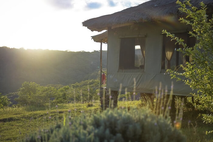 Guests stay in permanent tented chalets with brick-built bathrooms, comfortable beds, verandas and tasteful furnishings. The main area of the lodge includes an open restaurant, a bar, a lounge with a fireplace and a fire pit in the garden. There is also a pool with a view of the vast hilly landscape. The power supply is partly provided by solar energy.