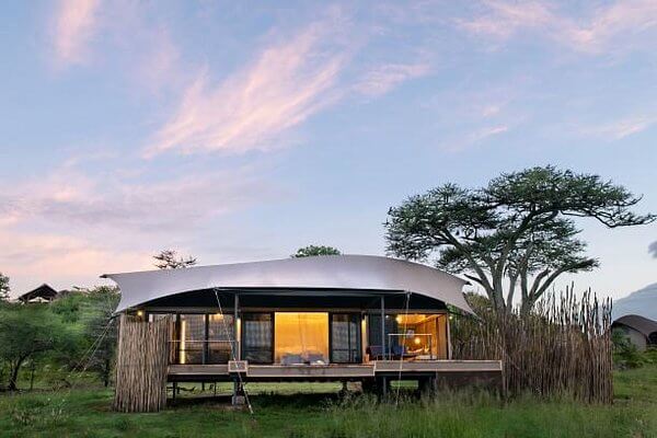 Guests stay in spacious tented suites with a private pool or plunge pool, en-suite bathroom with rain shower and bathtub, cozy sleeping area, lounge area and large veranda with a view. The furnishings are elegant, bright and designed in a modern safari style with natural materials, soft fabrics and clean lines. The central area offers a gourmet restaurant, a bar, an open lounge, a spa and an infinity pool with views into the distance. The facility is sustainably powered by solar energy.
