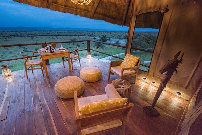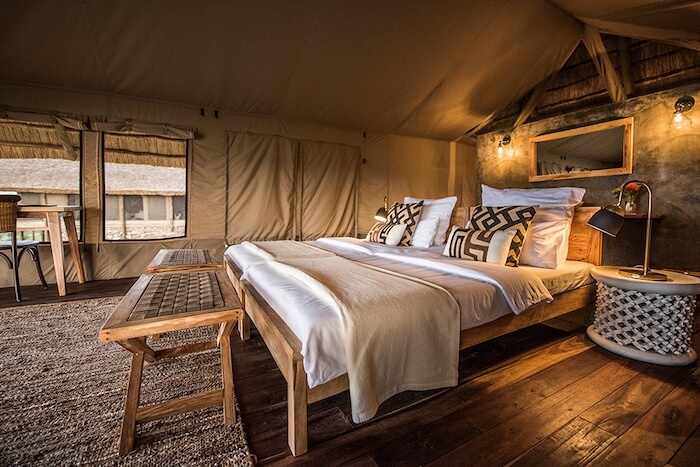 Guests stay in spacious tented suites with a wooden platform, en-suite bathroom, rain shower, high-quality beds, comfortable seating area and private veranda with a view of the savannah. The furnishings are elegant, modern and well thought-out with natural materials, handcrafted details and African accents. The central area offers a stylish restaurant tent, an open lounge, a bar and a fireplace for relaxed evenings. The facility is sustainably powered by solar energy.