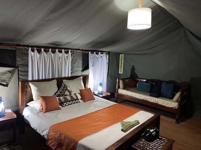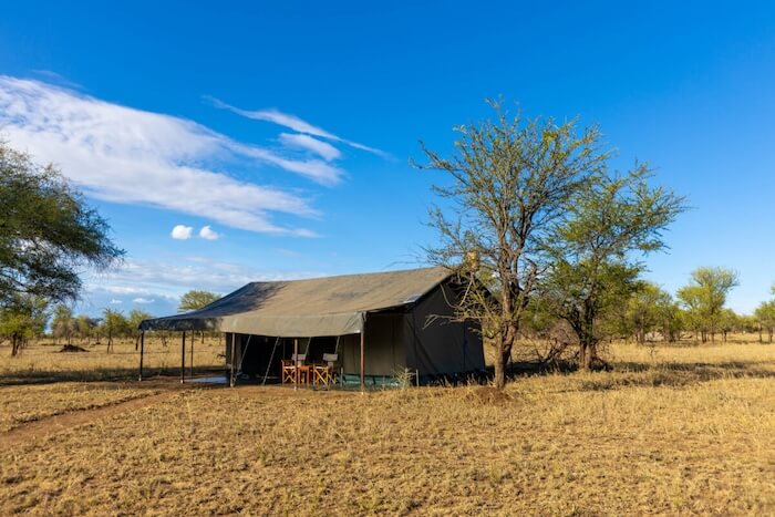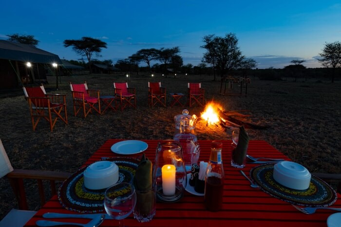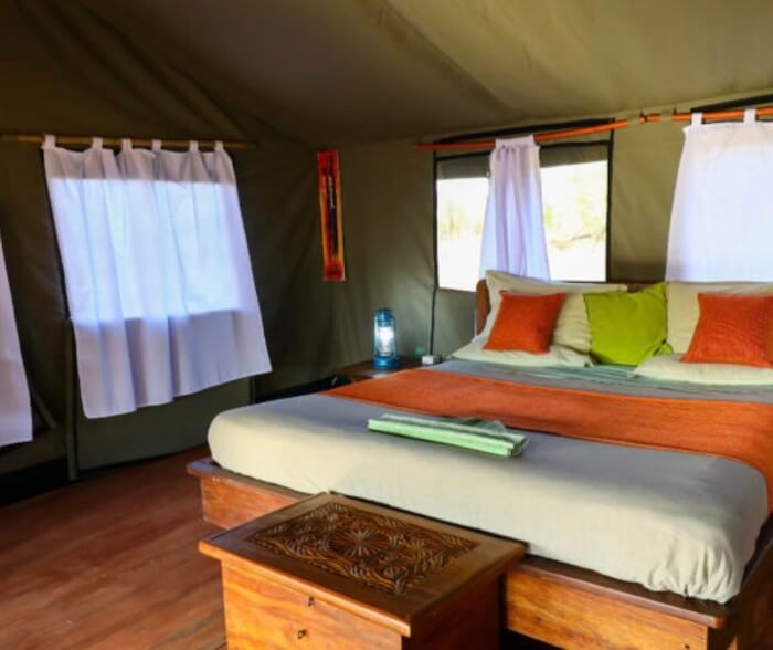 Guests stay in permanently installed tents with a wooden platform, private bathroom, shower, comfortable beds and a small veranda with a view of the savannah. The furnishings are simple, functional and neat with warm colors, natural materials and classic safari touches. In the central area there is a dining tent, a cozy outdoor seating area and a fireplace for evening chats. The power supply is provided by solar energy.