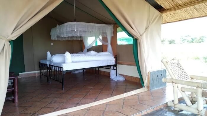 Guests stay in fixed tent suites with their own bathroom, shower, comfortable beds and a veranda with a view of the greenery. The furnishings are simple, functional and designed with natural colors and materials. The central area of the lodge includes a dining tent with indoor and outdoor seating, an open lounge, a small bar and a fireplace for relaxed evenings. The lodge is powered by environmentally friendly solar energy.