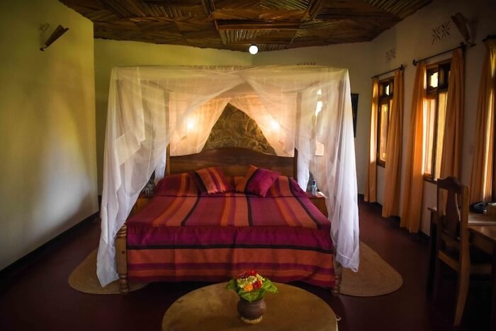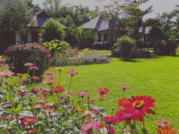 Los huéspedes se alojan en amplias cabañas, cada una de ellas con su propio cuarto de baño, acogedoras camas, una zona de estar y un porche. El mobiliario es sencillo pero de buen gusto y está decorado con colores cálidos. En la zona principal hay un restaurante con una gran terraza, un bar, un salón con chimenea y una piscina en medio de un hermoso jardín.
