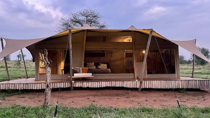 Los huéspedes se alojan en amplias suites en tiendas de campaña sobre plataformas de madera, con cuartos de baño privados, duchas de efecto lluvia, cómodas camas y terrazas privadas con vistas a la sabana. El interior es moderno, luminoso y está cuidadosamente diseñado con materiales naturales, colores cálidos y detalles elegantes. La zona central incluye un restaurante con mesas en el interior y al aire libre, un elegante salón, un bar y una piscina con vistas. El lodge utiliza energía solar para un suministro respetuoso con el medio ambiente.