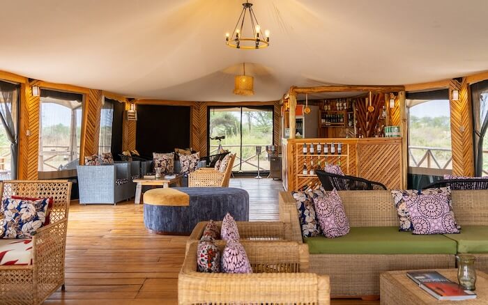 Los huéspedes se alojan en amplias suites instaladas permanentemente en tiendas de campaña sobre plataformas de madera, con cuartos de baño privados, duchas de efecto lluvia, cómodas camas y terrazas privadas con vistas panorámicas del paisaje. El mobiliario es elegante, cálido y funcional, con materiales naturales, detalles elegidos a mano y un estilo de safari atemporal. En la zona central, los huéspedes encontrarán un restaurante con mesas en el interior y al aire libre, un bar, un elegante salón y una chimenea para relajarse por la noche. Las instalaciones funcionan con energía solar respetuosa con el medio ambiente.