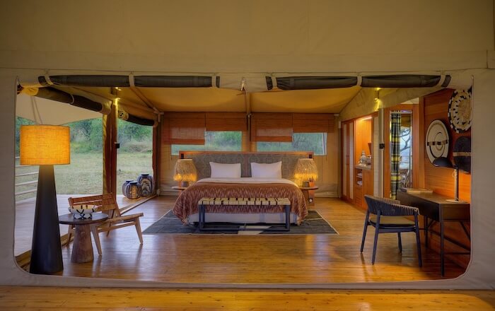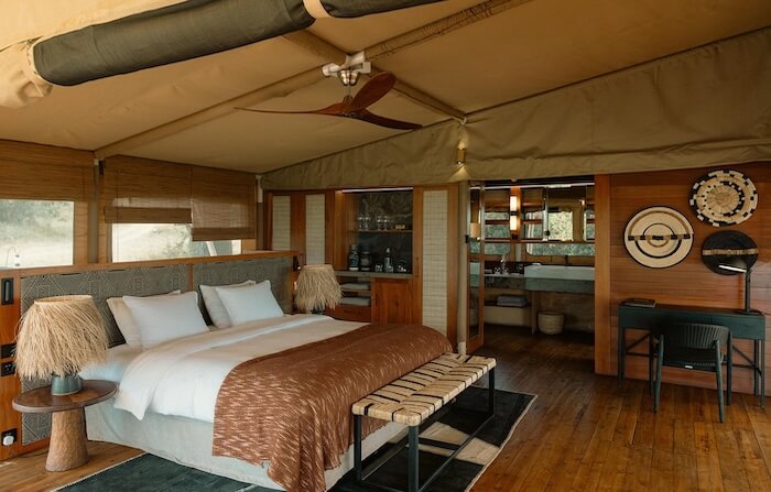 Los huéspedes se alojan en suites en tiendas de campaña especialmente espaciosas, con terraza de madera, bañera de hidromasaje privada, cuarto de baño con ducha de efecto lluvia y bañera, camas de lujo, zona de estar y porche con vistas a la naturaleza salvaje. El mobiliario es moderno, luminoso y de alta calidad, con materiales naturales, líneas claras y detalles elegidos a mano. La zona central incluye un restaurante gourmet con mesas en el interior y al aire libre, un salón, un bar, un spa y una chimenea. La energía se suministra de forma sostenible mediante energía solar.