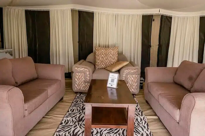 Los huéspedes se alojan en tiendas espaciosas con cuarto de baño, duchas, camas cómodas y terrazas privadas con vistas. El interior es elegante, funcional y está diseñado con materiales naturales: cálido, acogedor y con toques clásicos de safari. La zona central incluye una tienda restaurante abierta, un acogedor salón al aire libre y una chimenea para veladas relajadas. La energía solar garantiza un suministro respetuoso con el medio ambiente.