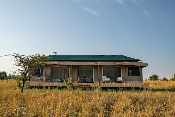 Los huéspedes se alojan en amplias suites en tiendas de campaña con tarima de madera, cuarto de baño privado, ducha de efecto lluvia, cómodas camas y una veranda con vistas al entorno natural. El mobiliario es funcional, elegante y está diseñado con colores cálidos y materiales naturales. La zona central incluye una carpa comedor con asientos interiores y exteriores, un acogedor salón al aire libre y una chimenea para las veladas bajo las estrellas. Toda la instalación funciona con energía solar respetuosa con el medio ambiente.