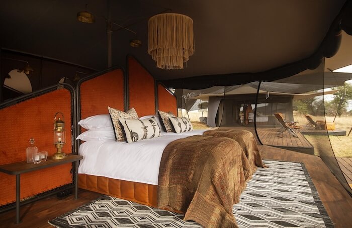 Los huéspedes se alojan en amplias suites en tiendas de campaña con tarima de madera, cuarto de baño privado, ducha de efecto lluvia, acogedoras camas y una veranda privada con vistas al paisaje. El mobiliario es de buen gusto, cálido y de alta calidad, con materiales naturales, detalles elegantes y gran atención al detalle. La zona central del campamento incluye una elegante tienda comedor, un salón con acogedores asientos y una chimenea al aire libre. Toda la instalación se alimenta de energía solar, respetuosa con el medio ambiente.