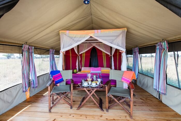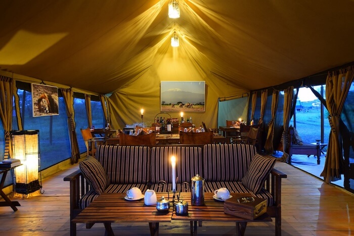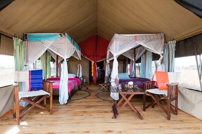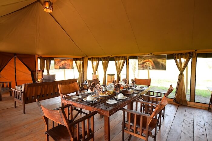 Los huéspedes se alojan en suites instaladas permanentemente en tiendas de campaña con plataformas de madera, cuartos de baño privados, duchas de efecto lluvia, cómodas camas y terrazas privadas con vistas a la sabana. El mobiliario es elegante, funcional y está diseñado con colores cálidos y materiales naturales. La zona central incluye una tienda restaurante con asientos interiores y exteriores, un acogedor salón y una chimenea al aire libre. Las instalaciones funcionan con energía solar respetuosa con el medio ambiente.