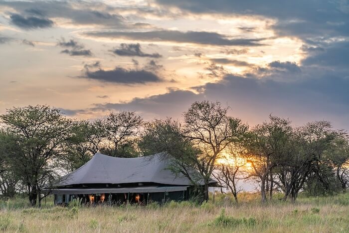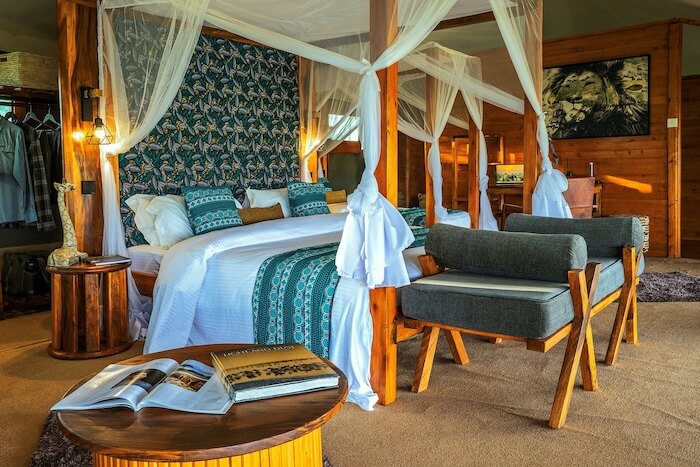 Los huéspedes se alojan en amplias suites en tiendas de campaña con tarimas de madera, cuartos de baño privados, duchas de efecto lluvia, cómodas camas y porches privados con vistas al paisaje. El mobiliario es de buen gusto, con telas de colores claros, materiales naturales y un toque de estética de safari atemporal. La zona central incluye una elegante tienda-restaurante con asientos en el interior y al aire libre, un acogedor salón, un bar y una chimenea para veladas relajadas. Las instalaciones funcionan de forma sostenible con energía solar.