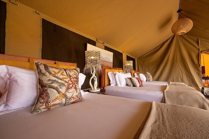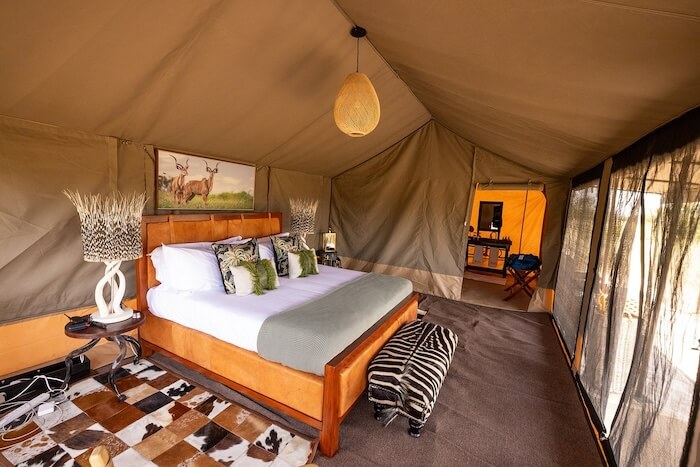 Los huéspedes se alojan en amplias suites en tiendas de campaña con tarima de madera, cuarto de baño privado, ducha de efecto lluvia, camas de gran calidad, acogedora zona de estar y terraza privada con vistas. El mobiliario es elegante, cálido y cercano a la naturaleza, con colores vivos, detalles elegidos a mano y modernos toques de safari. La zona central incluye una elegante tienda restaurante, un salón abierto, un bar y una chimenea para disfrutar de acogedoras veladas. La energía solar garantiza un suministro respetuoso con el medio ambiente.