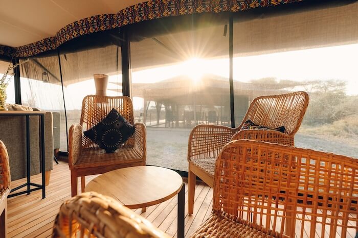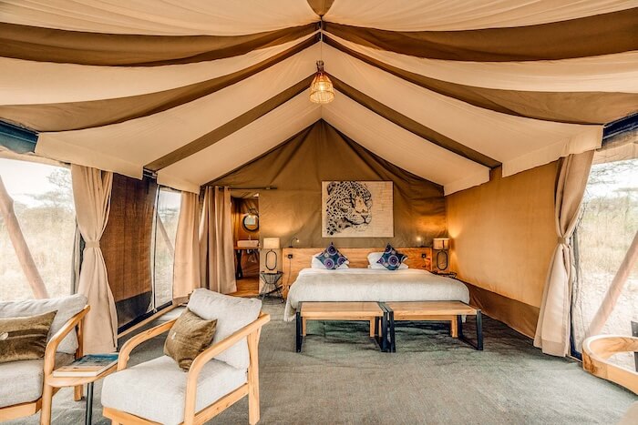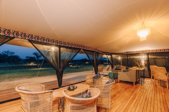 Los huéspedes se alojan en amplias suites con plataformas de madera, cuartos de baño privados, duchas de efecto lluvia, cómodas camas y terrazas privadas con vistas a la sabana. El interior está decorado con gusto, con colores cálidos, detalles elegidos a mano y materiales naturales. En la zona central del campamento hay una tienda restaurante con asientos en el interior y al aire libre, un salón, un bar y una hoguera para pasar las veladas al aire libre. Todas las instalaciones funcionan con energía solar respetuosa con el medio ambiente.
