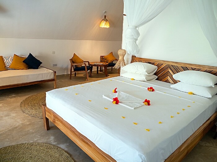 Las habitaciones de Villa Unaweza son luminosas, espaciosas y están amuebladas con gran atención al detalle. Camas grandes, cuarto de baño privado con ducha y pequeñas terrazas o balcones garantizan la comodidad y la intimidad. El jardín del complejo es verde y está bien cuidado, con hamacas, acogedoras zonas para sentarse y una zona común cubierta donde también se sirve el desayuno. El mobiliario sigue un estilo sencillo y natural que encaja bien con el entorno.