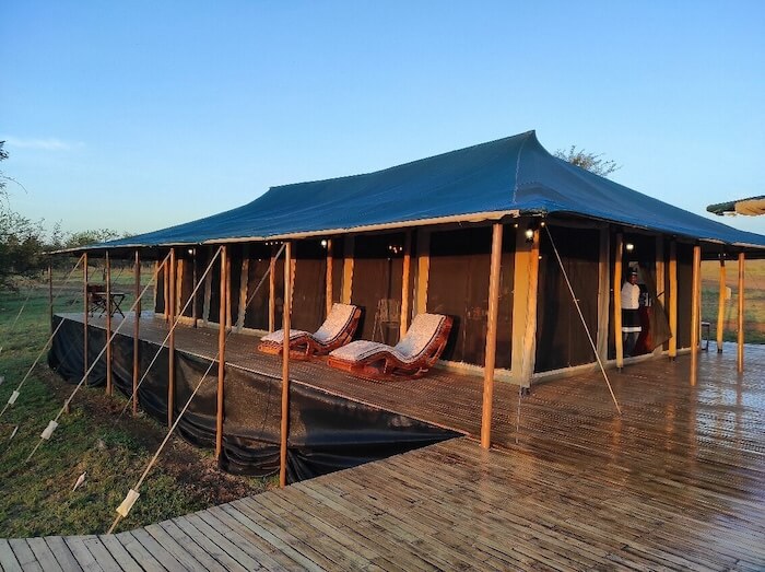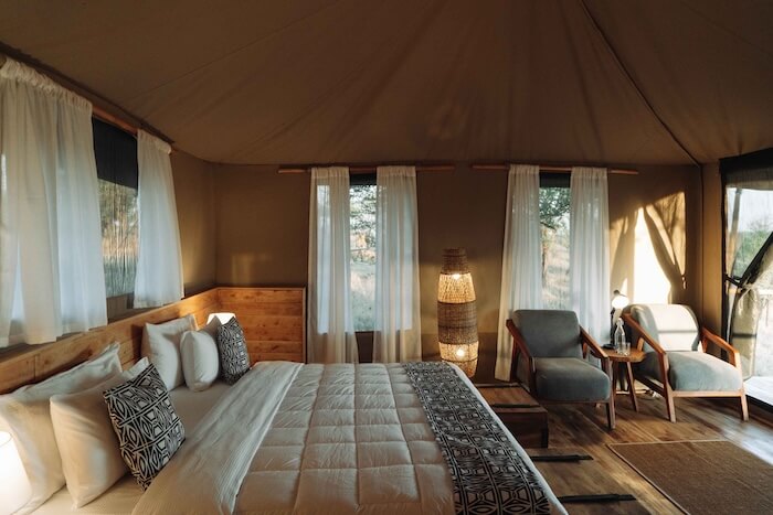 Die Zelte sind großzügig und hochwertig eingerichtet mit komfortablen Betten, eigenem Bad, Sitzgelegenheit und einer privaten Veranda mit Blick in die Landschaft. Natürliche Materialien, stimmige Farben und liebevolle Details schaffen ein stilvolles, ruhiges Wohngefühl. Der zentrale Bereich bietet ein offenes Restaurantzelt, eine Lounge und gemütliche Plätze unter freiem Himmel. Das Kiriche Luxury Camp vereint durchdachten Komfort mit natürlicher Eleganz.