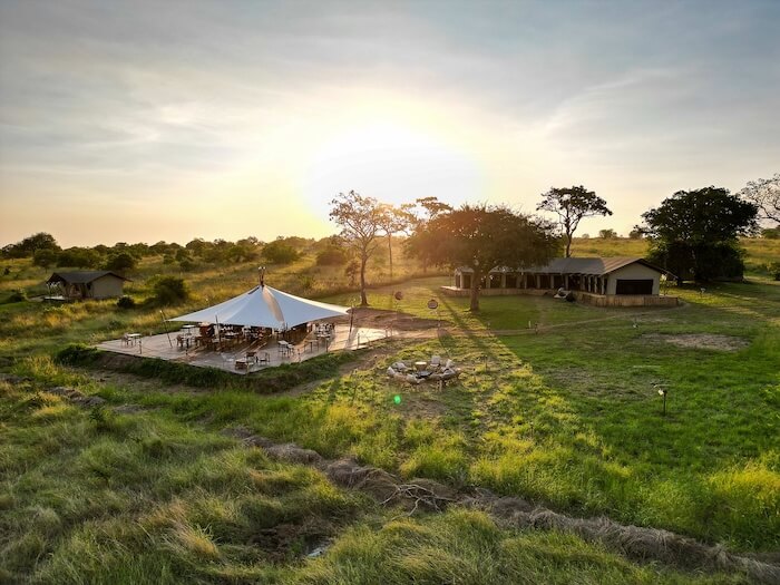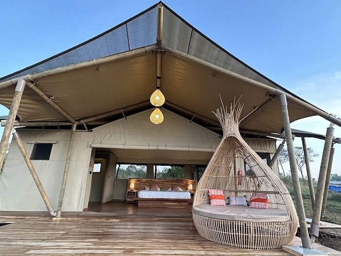 Die Gäste wohnen in großzügigen Zeltsuiten mit Holzplattform, eigenem Bad, Regendusche, bequemen Betten, Sitzecke und einer privaten Veranda mit Ausblick auf die Natur. Die Einrichtung ist stilvoll, hell und komfortabel – mit hochwertigen Materialien, natürlichen Farben und liebevollen Details. Der zentrale Bereich umfasst ein elegantes Restaurant, eine Lounge, eine Bar und eine Feuerstelle für entspannte Abende unter freiem Himmel. Die Stromversorgung erfolgt umweltfreundlich über Solarenergie.