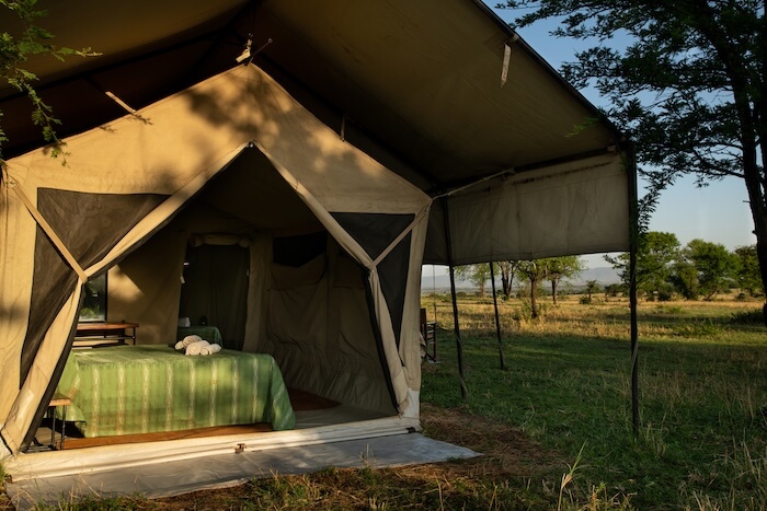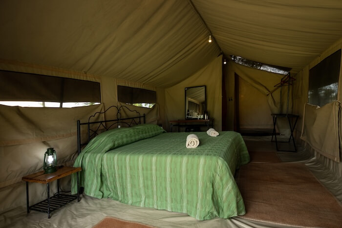 Die Gäste wohnen in funktional eingerichteten Zelten mit eigenem Bad, Dusche, bequemen Betten und einer kleinen Veranda mit Blick in die Natur. Die Einrichtung ist schlicht, gepflegt und auf das Wesentliche konzentriert – mit warmen Farben und Safari-Flair. Der zentrale Bereich des Camps bietet ein Speisezelt, eine gemütliche Sitzecke im Freien und eine Feuerstelle für entspannte Abende unter dem Sternenhimmel. Solarenergie sorgt für die Stromversorgung.