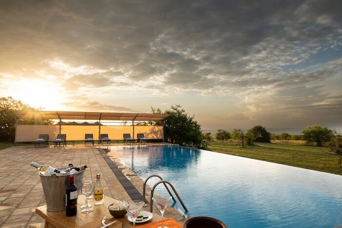 Die Gäste wohnen in festen Zeltsuiten mit Massivdach, großzügigem Bad, Regendusche, bequemen Betten und einer privaten Veranda mit Ausblick. Die Einrichtung ist stilvoll, hell und naturverbunden – mit hochwertigen Materialien, warmen Farben und afrikanischen Designelementen. Der zentrale Bereich umfasst ein Restaurant mit Innen- und Außenplätzen, eine Bar, eine Lounge, eine Feuerstelle und einen Pool mit Blick auf die Weite. Die Versorgung erfolgt nachhaltig über Solarstrom.