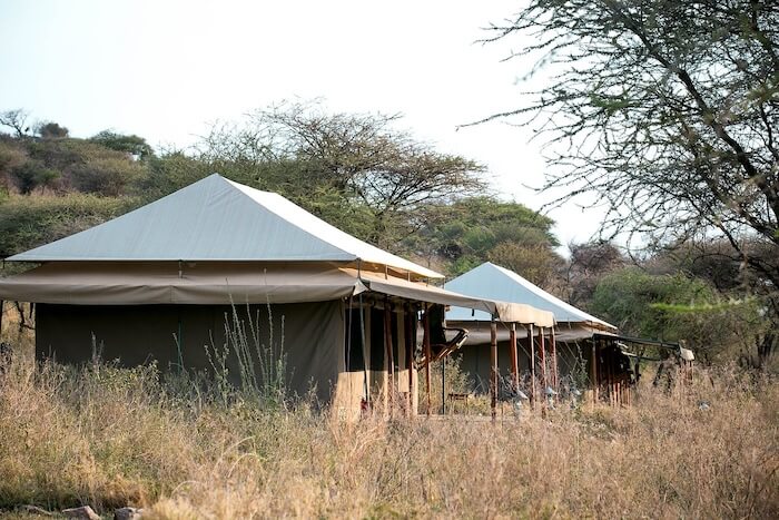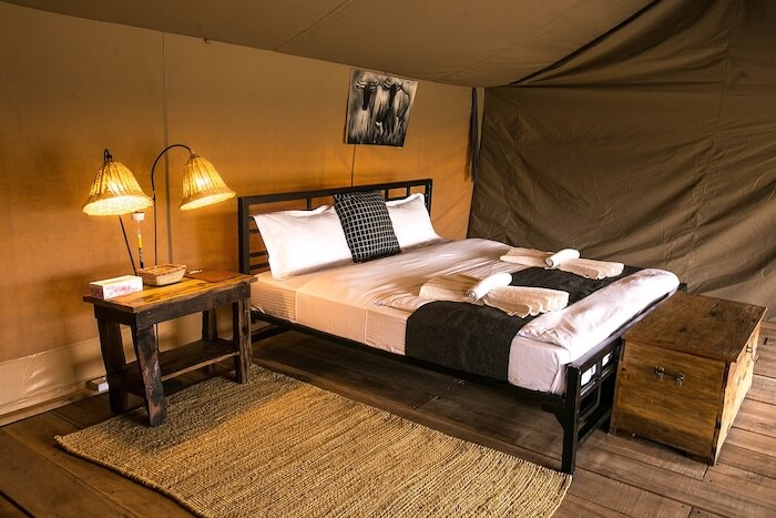 Die Gäste wohnen in fest aufgebauten Zelten mit Holzplattform, eigenem Bad, Dusche, bequemen Betten und kleiner Veranda mit Blick in die Landschaft. Die Einrichtung ist schlicht, funktional und gepflegt – mit natürlichen Farben, Safariatmosphäre und einem klaren Fokus auf Zweckmäßigkeit. Der zentrale Bereich umfasst ein offenes Speisezelt, eine kleine Sitzecke im Freien und eine Feuerstelle für abendliche Gespräche. Die Anlage wird mit Solarstrom betrieben.