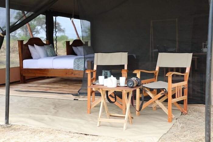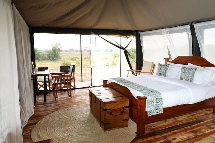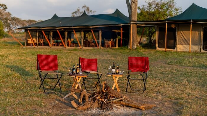 Die Gäste wohnen in geräumigen Zeltsuiten mit eigenem Bad, Dusche, bequemen Betten und einer privaten Veranda mit Blick in die Wildnis. Die Einrichtung ist schlicht, stilvoll und mit natürlichen Materialien gestaltet – funktional und gleichzeitig gemütlich. Der zentrale Bereich des Camps umfasst ein Speisezelt mit Innen- und Außenplätzen, eine offene Lounge und eine Feuerstelle für entspannte Abende unter dem Sternenhimmel. Die gesamte Anlage wird nachhaltig mit Solarstrom betrieben.
